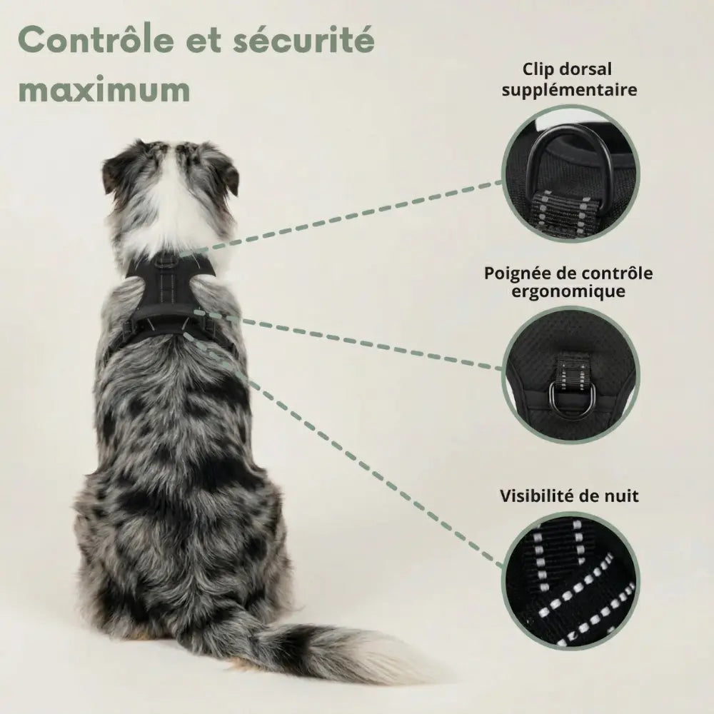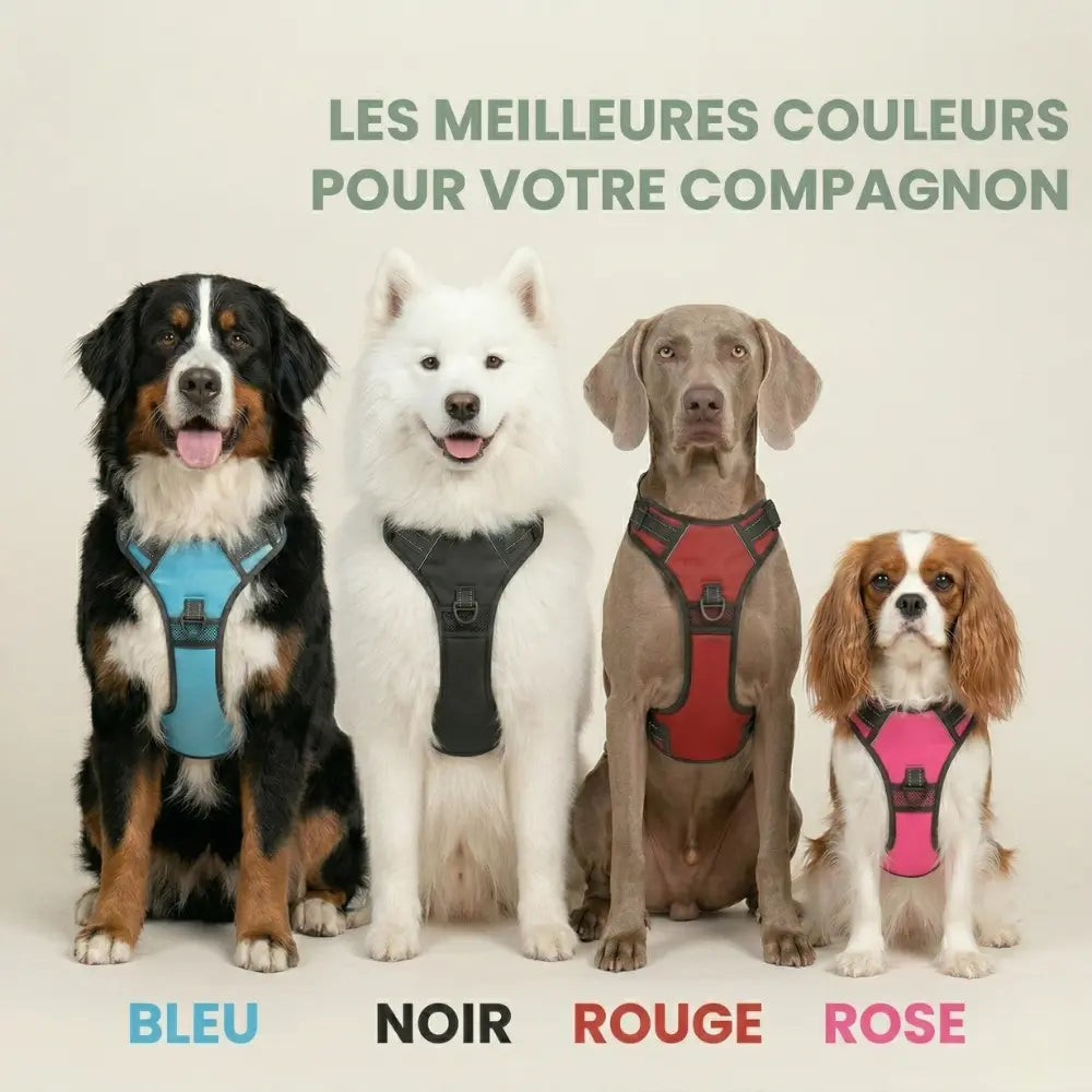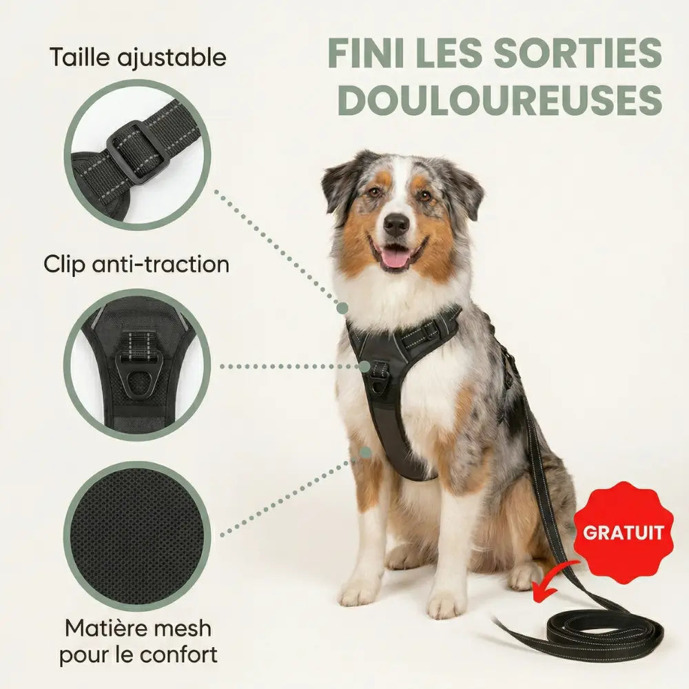 Un harnais protège la santé de votre chien. Il répartit la force de traction sur le poitrail et les épaules au lieu d'écraser la trachée et les cervicales comme le fait un collier. C'est plus sûr, plus confortable, et cela réduit considérablement les risques de blessures.
