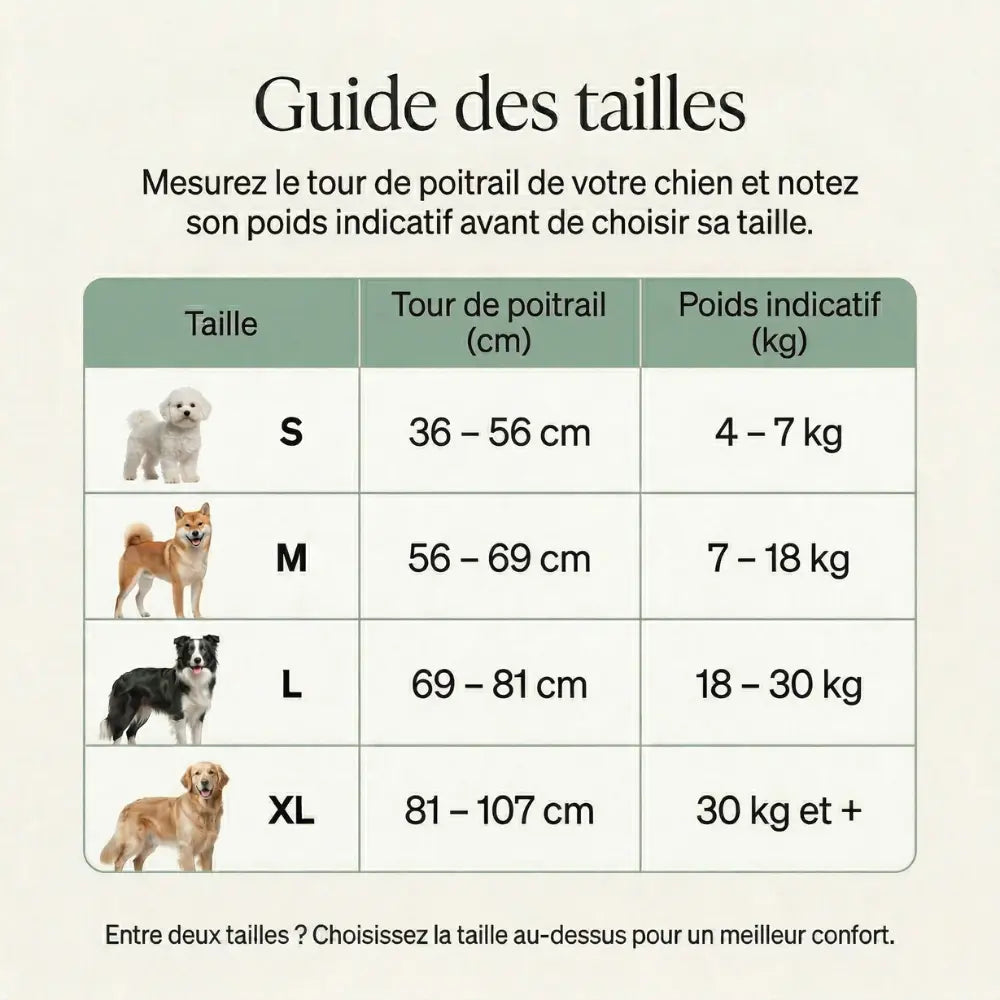 Un coup d’œil au guide des tailles vous aidera à trouver la taille idéale pour votre compagnon à quatre pattes. Si la taille de votre chien se situe entre deux tailles, choisissez la plus grande ; les sangles réglables garantiront un ajustement parfait.