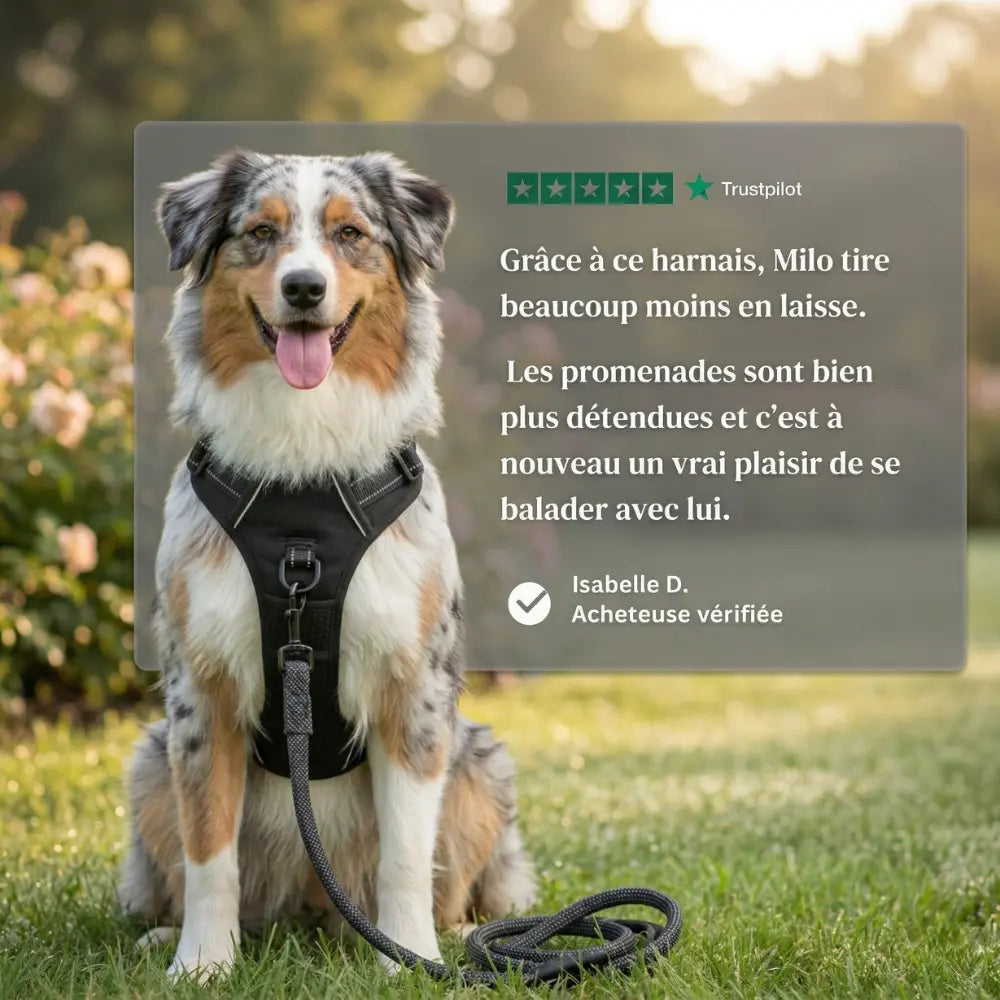 Notre harnais est conçu pour répartir la pression uniformément sur le corps du chien lorsqu'il tire. Contrairement à un collier, cela ne l'étrangle pas, mais le redirige en douceur vers vous. Cela incite votre chien à se détendre et vous offre immédiatement plus de contrôle pour des balades agréables.